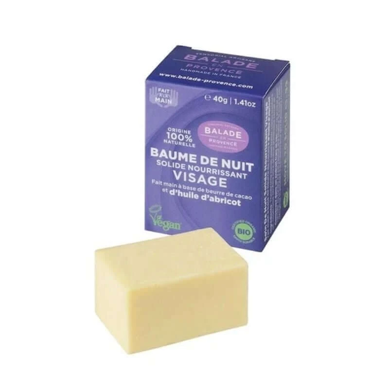 Le Baume de Nuit Solide de la marque Balade en Provence est formulé avec des ingrédients bio en France ! Il nourrit intensément la peau et lui redonne tout son éclat.