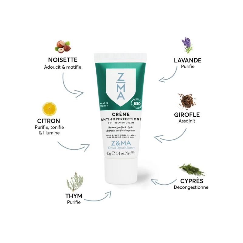 La Crème Anti-Imperfections de la marque Z&MA hydrate, purifie et régule les peaux grasses et/ ou à tendance acnéiques.