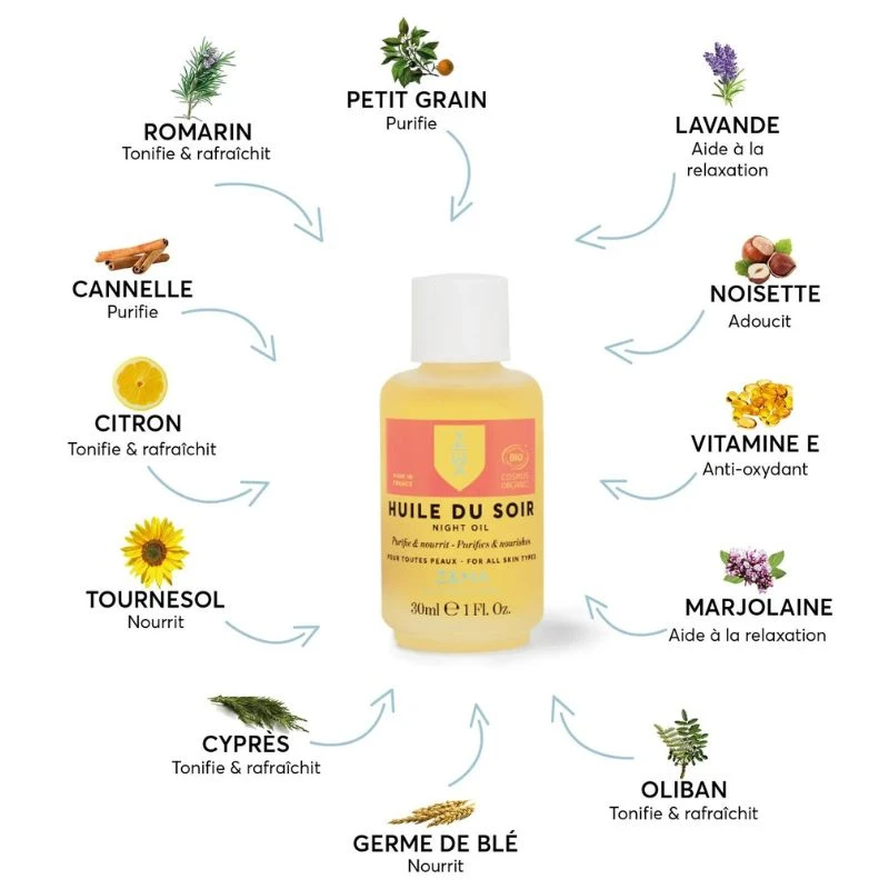 L’action purifiante de cette Huile du Soir est apportée par les huiles essentielles de petit grain, de cannelle, de girofle et de thym.