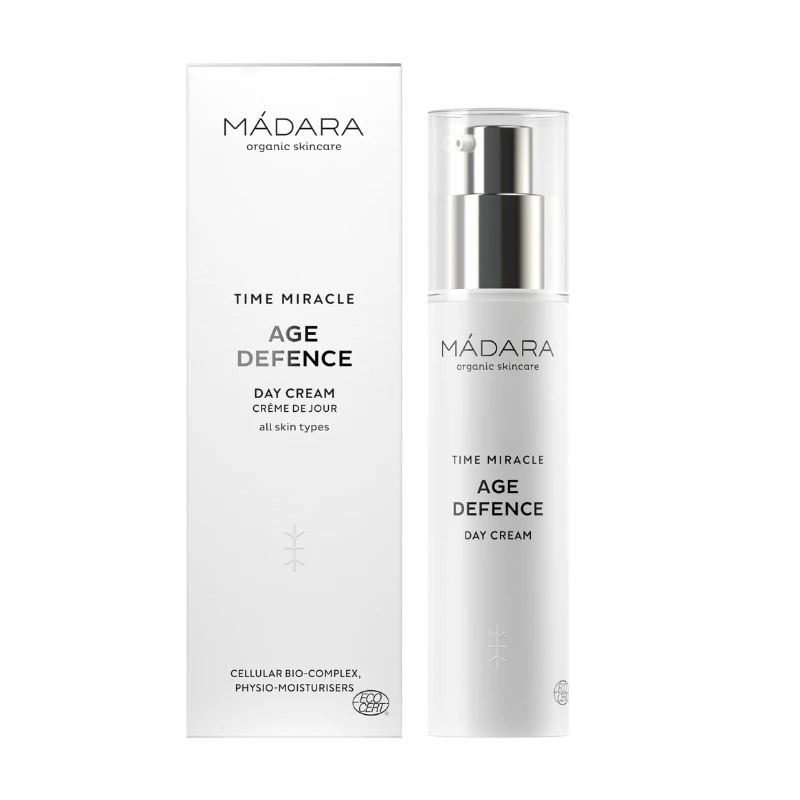 La crème de jour anti rides Age Defence Time Miracle de Madara conçue pour les peaux matures réduit efficacement les signes de l’âge : lisse, raffermit et réactive le renouvellement cellulaire tout en redonnant de l’éclat aux teints fatigués. Formulée à base d’eau de bouleau raffermissant et du Bio Complexe de réparation cellulaire Madara, les résultats sont visibles dès la première application et après 4 semaines d’utilisation.