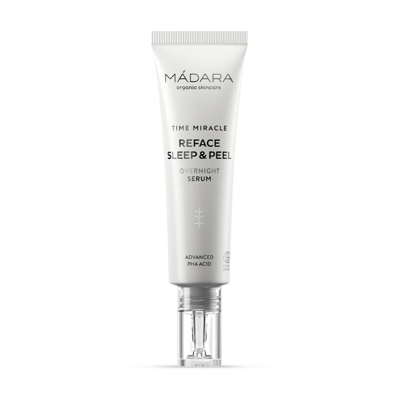 Le Sérum Resurfaçant Sleep & Peel de la gamme Time Miracle de Mádara est un sérum qui agit sur les signes du vieillissement cutané pendant la nuit, moment où la peau se régénère le mieux.